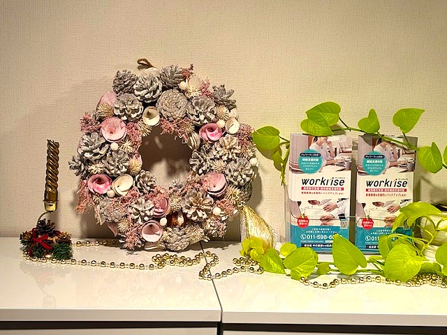 ワークライズのエントランスにはクリスマスリースが飾られました